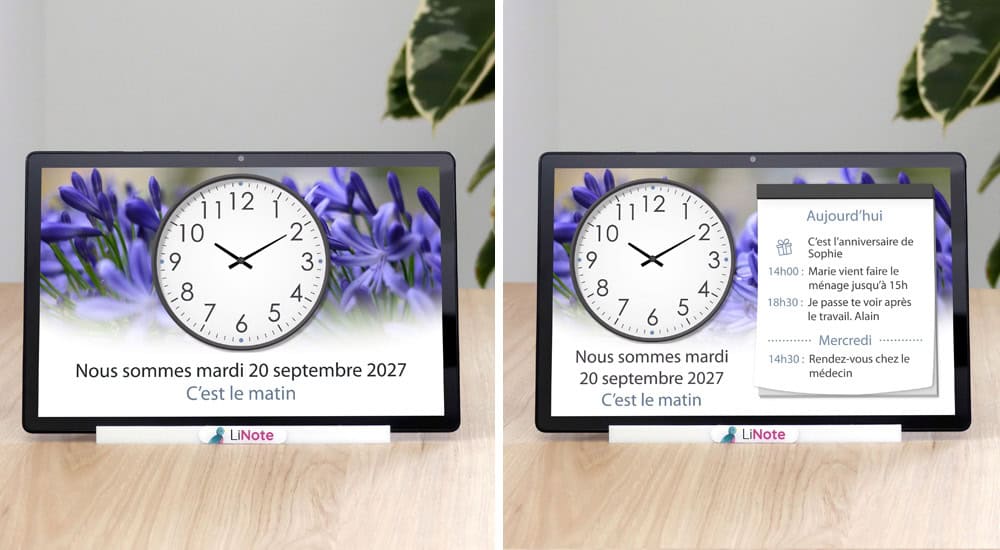💡 Bon à savoir L’horloge jour nuit LiNote est entièrement pilotable à distance par la famille. Votre proche n’aura rien à toucher. De votre côté, vous pourrez personnaliser l’interface, lui envoyer des messages de rappels, remplir son agenda, etc.