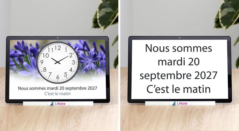 Spécialement pensée pour les personnes âgées, l’horloge pour malvoyant LiNote dispose d’un grand écran de 10 pouces. Ce dernier permet d’afficher en très gros caractères :