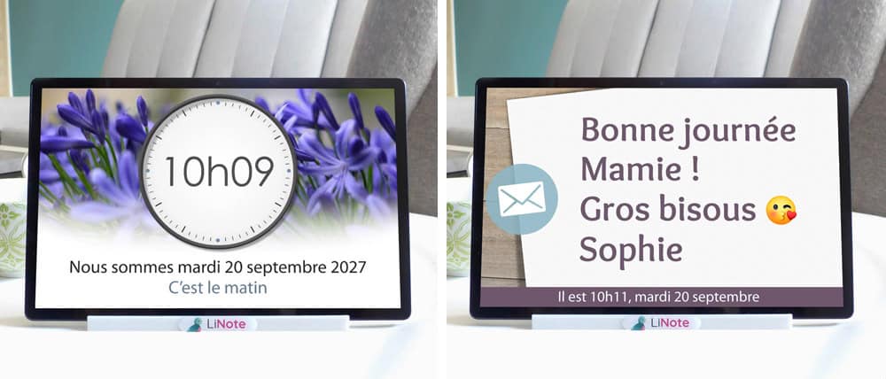 de recevoir des messages de rappels et des petits mots affectueux de toute sa famille.Ces derniers s’afficheront en grand sur l’écran et seront automatiquement lus vocalement par la LiNote (à deux reprises).