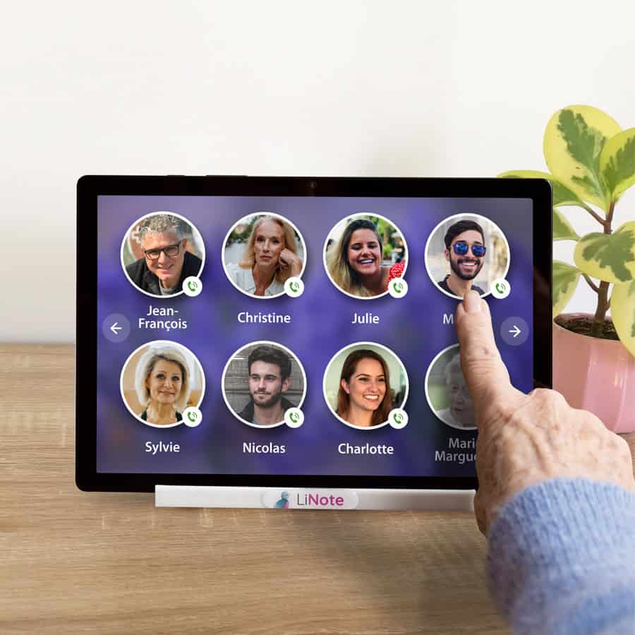 LiNote affiche les contacts téléphoniques sous forme de gros boutons avec la photo du contact à l’intérieur. Il suffit d’appuyer dessus pour appeler.